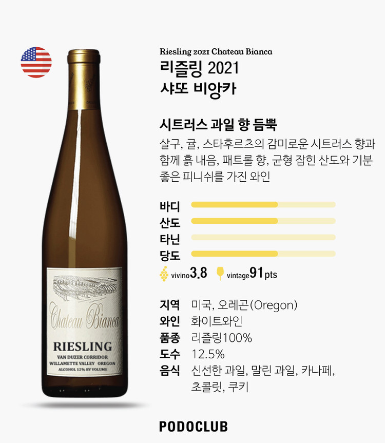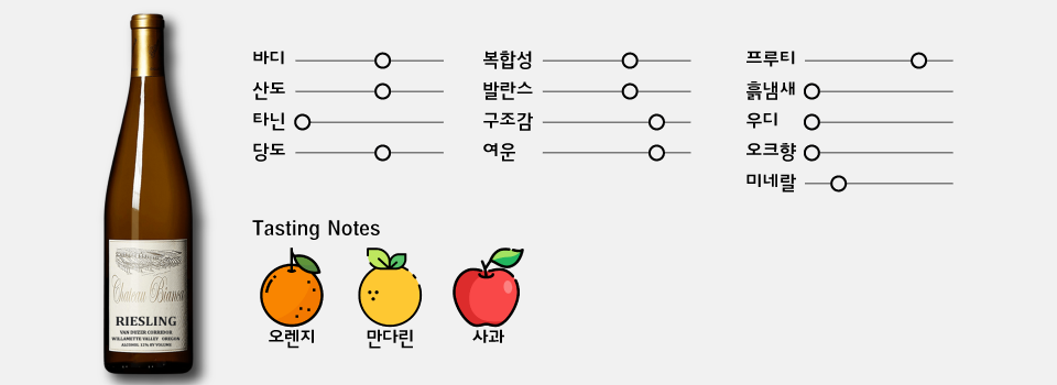오레곤의 심장부라고 할 수 있는 윌라메트 밸리에서 자란 리즐링은 저온 발효를 통해 당도를 올리고 과실 캐릭터에 집중하여 생산했기 때문에 섬세하면서도 집중도 높은 과실 향을 자랑합니다.