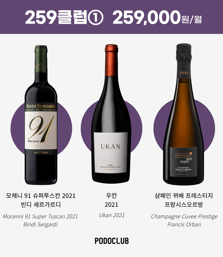세계적으로 이름 높은 명품 와인 산지의 와인을 즐길 수 있는 259클럽① 와인을 선택하기 어렵거나 다양한 와인들을 경험해 보고 싶은 분들을 위해 포도클럽이 정성껏 준비한 와인 2~3병을 즐겨보세요. |