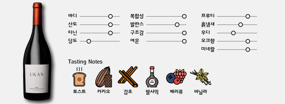 오래된 포도 나무의 우아함을 갖춘 와이너리 우칸의 이름을 건 대표 와인! 스페인 리오하(Rioja), 대표 레드와인 품종인 템프라니요(Tempranillo) 100% 와인으로 고소한 토스트 노트에 카카오, 커피의 뉘앙스, 시간이 지남에 따라 품종 특징인 야생 산딸기 같은 베리류, 발사믹, 감초 향이 피어나 와인에 한 층 더 풍미를 더해줍니다. 가볍지 않지만 너무 무겁지도 않은 바디감에, 견고한 구조감과 균형 잡힌 타닌이 세련된 우아함을 만들어냅니다.