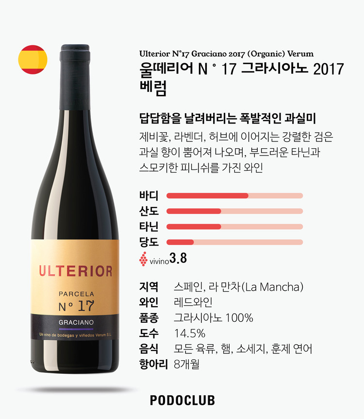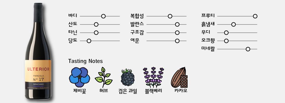 울떼리어 그라시아노는 품종과 라 만차(La Mancha) 땅의 완벽한 결합이라는 평을 받고 있어요! 스페인의 정열을 그대로 표현한 와인으로써 부담 없는 가격까지 더해져 가심비와 가성비를 모두 만족시킬만한 와인이랍니다 🤗