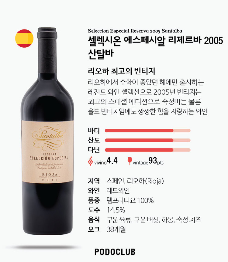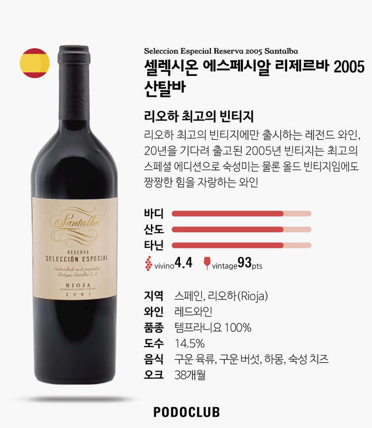 올드빈티지 와인이 가진 리스크 때문에 구매 망설이실 필요가 없어요! 와이너리의 세심한 컨트롤 하에 제대로 숙성된 와인이랍니다. 산탈바의 야심찬 대작인 이 와인은 잘 숙성된 템프라니요가 어떤 시간을 거쳤는지 그대로 보여줍니다. 앞으로 10년 이상도 문제 없이 짱짱할거라고 자신 있게 말씀드려요! 매해 만들어지는 와인이 아닙니다. 리오하(Rioja) 최고의 빈티지라고 알려진 2005 빈티지에만 특별하게 소량 생산된 템프라니요로 올드 빈티지임에도 힘이 짱짱하게 살아있습니다.