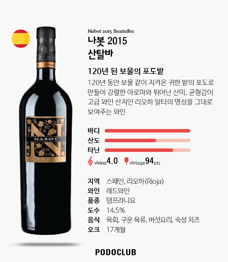 1964년부터 리오하 고급 와인 양조를 이끈 장본인이자 보데가 산탈바의 소유주인 산티아고 이할바 Santiago Ijalba는 할아버지 이전 세대부터 가지고 있던 오래된 포도밭을 보물같이 여겼습니다. 리오하의 대표 품종 템프라니요에 조부모가 태어나기도 전부터 소유하고 있던 오래된 포도밭의 포도를 더해 만든 "나봇 Nabot" 은 산탈바의 전통과 세월이 녹아있는 와인으로, 우수한 빈티지의 해에만 생산됩니다.