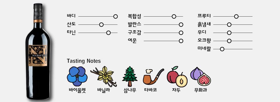 가문의 보물처럼 물려 받은 포도밭의 오래된 포도나무로 만들었기 때문에, 이스라엘의 이야기에서 영감을 받아, 이 와인의 이름은 "나봇(NABOT)"이 되었습니다. 뺏고 싶을 정도로 욕심 나는 와인 - 나봇 한 병 하세요!