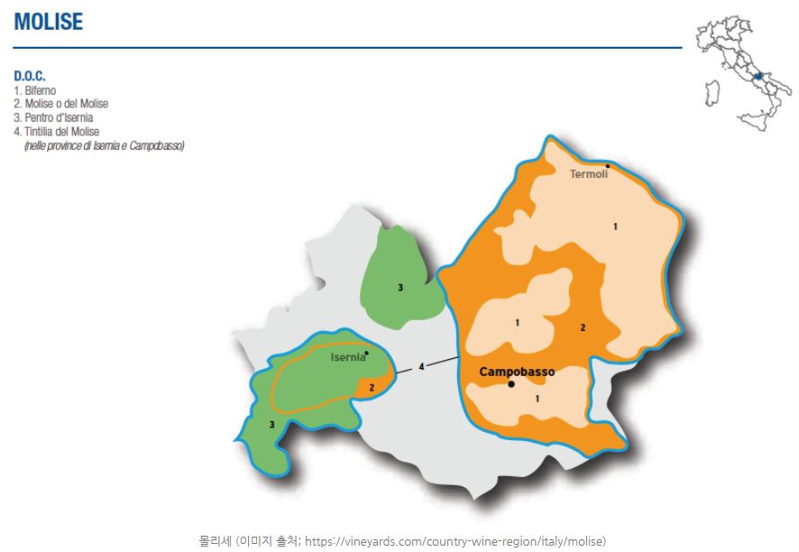 몰리제(Molise)는 이탈리아 남부 지역이나, 중부와 남부 중간 지점에 위치해 있습니다. 북쪽에 아부르쪼 Abruzzo, 동쪽에 풀리아 Puglia, 남쪽에 캄파니아 Campania, 서쪽에 라치오 Lazio 와 가까이 하고 있으며, 전체 면적의 58%가 산악지대, 42%가 구릉과 언덕으로 이루어져 있습니다. DOCG는 없지만 4개의 DOC가 지정되어 있습니다. Biferno, Molise del Molise, Pentro d'Isernia, Tintilia del Molise.