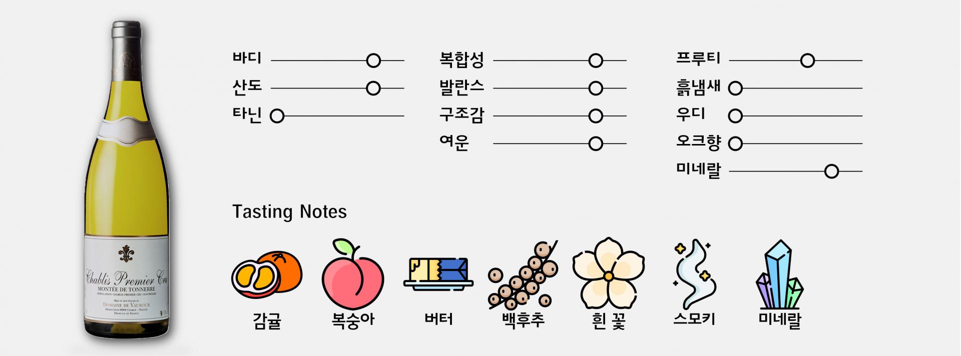 "프리미에 크뤼 몽떼 드 또네르"는 샤블리 그랑 크뤼 바로 옆에 위치해 있기 때문에 그랑 크뤼 퀄리티와 가장 가까운 밭으로 평가받고 있으며 완성도가 높은 것으로 잘 알려져 있어요.
