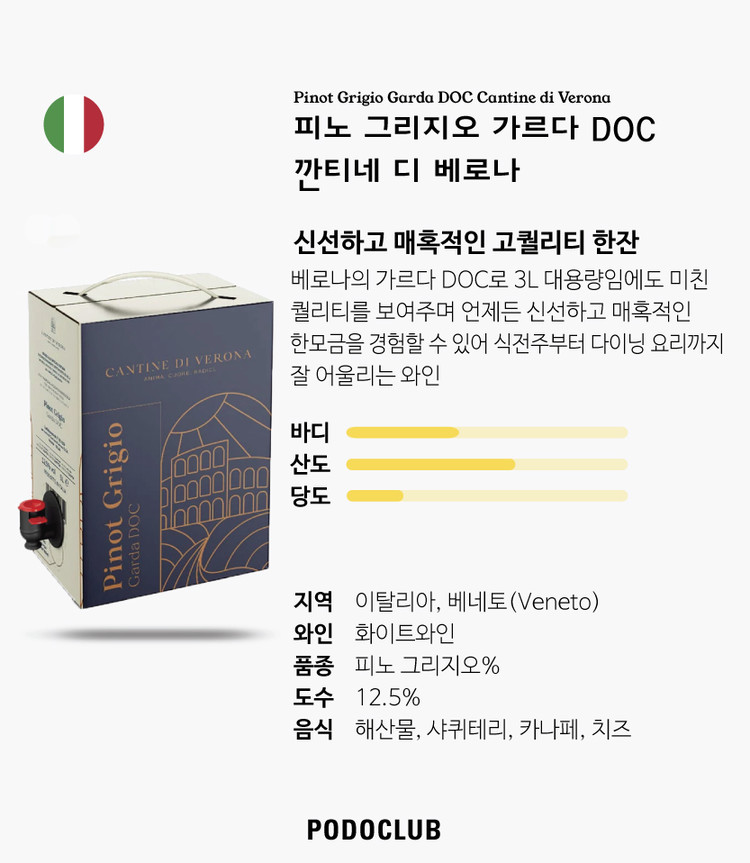 피노 그리지오를 대표 품종으로 생산하는 것으로 알려진 가르다 DOC 등급의 와인을 오랜 기간동안 신선하게 마셔볼 수 있도록 슈링크 방식으로 담았습니다.