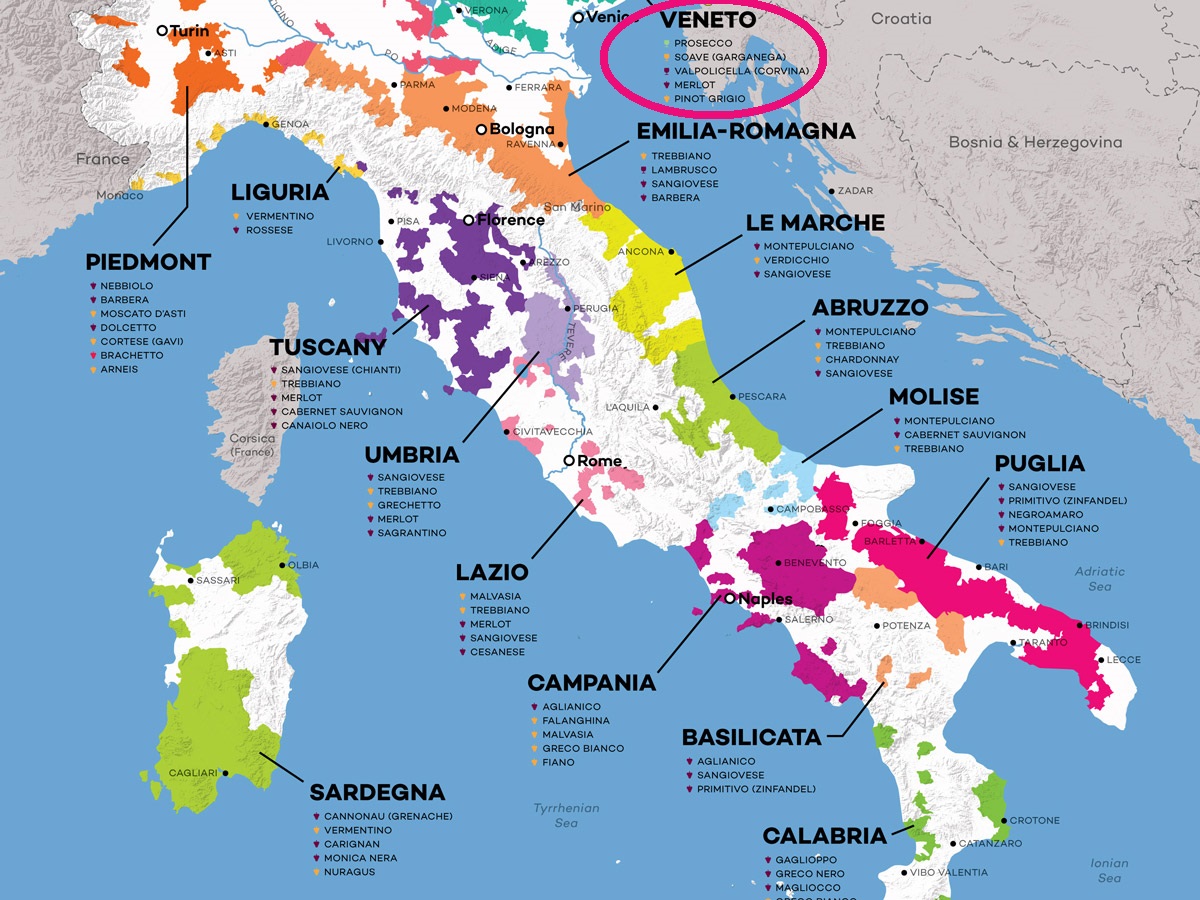 이탈리아 북동쪽에 위치한 베네토(Veneto)는 베네치아 아래, 알프스 산기슭에 위치한 프로세코의 생산지이자 1966년 최초의 이탈리아 와인 루트가 시작된 곳입니다. 이탈리아에서 와인 생산량이 가장 많은 곳으로 세계적으로 잘 알려진 레드와인 발폴리첼라(Valpolicella), 화이트와인 소아베(Soave), 스파클링 와인 프로세코(Prosecco)의 주요 산지이죠.