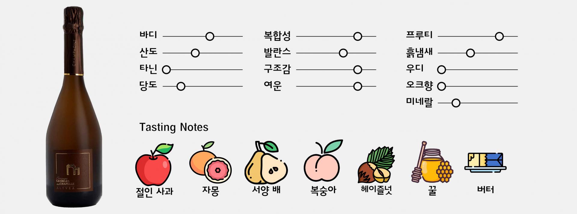 잔에 따르면 미세하고 정제된 버블이 차분하게 피어오르며, 크리미하고 밀도 있는 무스가 안정적인 첫 인상을 만듭니다. 화려함보다는 숙성에서 비롯된 깊이와 균형이 중심을 잡아주며, 마실수록 구조와 완성도가 또렷해지는 타입의 샴페인입니다.