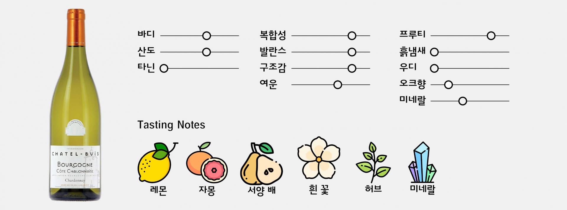 샤텔뷔(Chatel-Buis)는 비네롱 드 뷔시가 전개하는 부르고뉴 블랑 브랜드로, 부르고뉴 샤르도네 AOC 리스트 중 클래식한 캐릭터를 담아낸 접근성 좋은 라인업 명칭입니다.